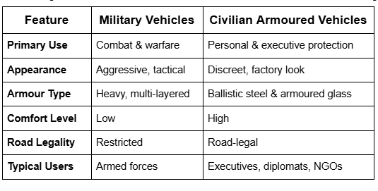 Military vehicles are designed for warfare and tactical dominance. Civilian armoured vehicles are built for personal, corporate, and diplomatic protection in urban and intercity environments.